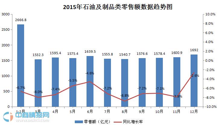 以下為2015年中國石油及制品類零售額數據趨勢圖