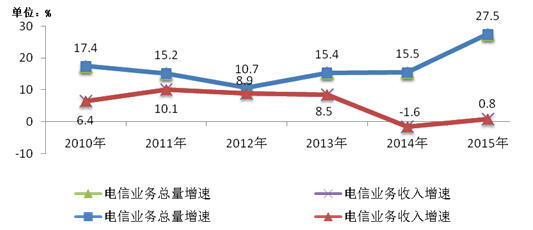 圖1-12010-2015年電信業務總量與業務收入增長情況