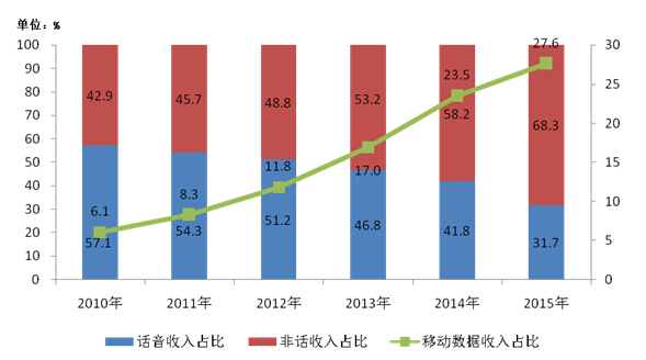 圖1-22010-2015年話音業務和非話音業務收入占比變化情況