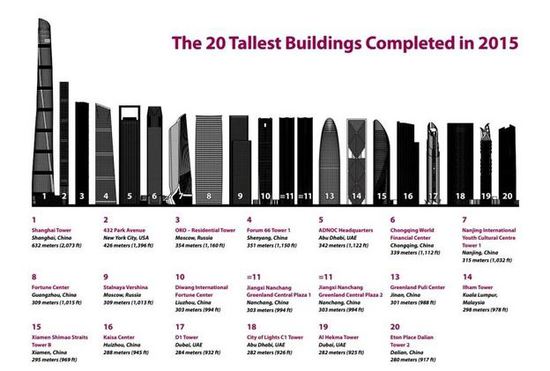 而紐約奢華公寓大樓432 Park Avenue僅次于上海中心大廈,成為2015年新建成的第二高樓。