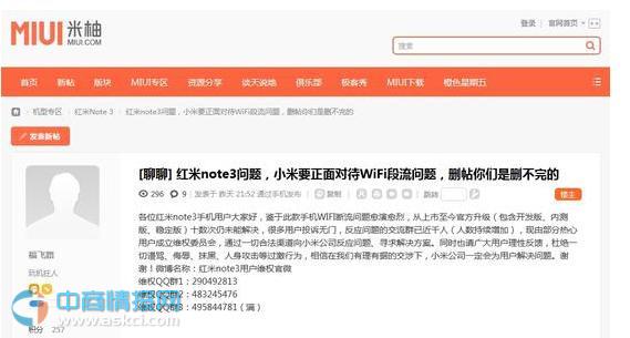 有網友表示,小米官方已開始刪除反映紅米Note3 WiFi斷流的帖子,無處投訴的網友已經建立了多個千人維權QQ群。