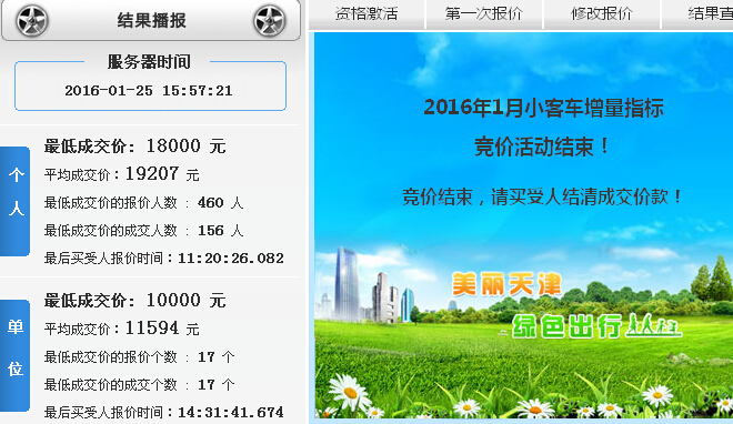 2016年1月天津車牌競價結果:個人成交均價1.8萬元(附查詢網址)