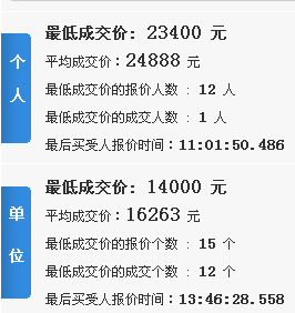 2016年1月杭州車牌競價自1月25日上午9時開始,下午15時結束,本次競價全過程共6個小時。2016年1月杭州車牌競價的最低成交價為個人23400元、單位14000元;平均成交價為個人24888元、單位16263元。競價全過程由公證處予以公證。