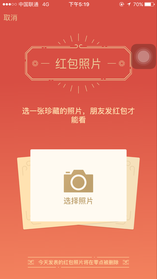 3.點擊朋友圈右上角的照相按鈕,可看到三個選項,即紅包照片、照片和小視頻,而紅包照片就是新玩法啦。
