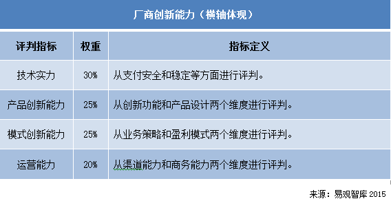 Analysys易觀智庫分析認為,中國第三方移動支付市場目前處于發展初期,支付機構如何用更加優秀的產品與運營推廣爭奪用戶顯得尤為重要。因此技術實力、產品創新能力、模式創新能力和運營能力是評價廠商現有創新能力的重要指標。