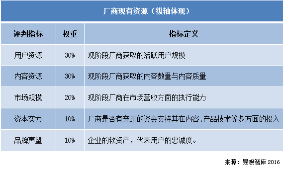 Analysys易觀智庫分析認為,中國網絡視頻市場在用戶移動化遷徙加快,內容市場競爭激烈等因素影響下進入新一輪的競爭。用戶資源、內容資源、市場規模、資本實力、品牌聲望是支撐目前中國網絡視頻市場廠商在市場中獲得競爭優勢的重要指標。