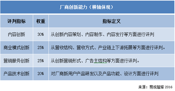 Analysys易觀智庫分析認為,目前中國網絡視頻市場用戶忠誠度較低,廠商需要不斷創新發展以獲得市場競爭優勢。其中商業模式創新、營銷服務創新、內容創新、產品技術創新是評價廠商創新能力的重要指標。