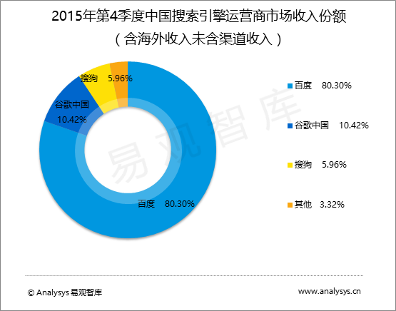2015年第4季度,在未含渠道收入的中國(guó)搜索引擎運(yùn)營(yíng)商市場(chǎng)收入份額中,百度占到80.30%,谷歌中國(guó)為10.42%,搜狗為5.96%,其他為3.32%。