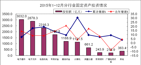 1-12月,通信設備行業完成投資1188.89億元,同比增長9.6%。廣播電視設備行業完成投資218.93億元,同比增長9.5%。電子計算機行業完成投資1121.5億元,同比增長30.6%。家用視聽設備行業完成投資243.9億元,同比增長7.3%。電子器件行業完成投資3032.1億元,同比增長7.3%。電子元件行業完成投資2878.3億元,同比增長17.9%。電子測量儀器行業完成投資661.2億元,同比增長9.8%。電子工業專用設備行業完成投資1750.8億元,同比增長13.9%。電子信息機電行業完成投資2316.3億元,同比增長19.6%。