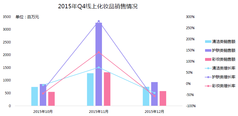 2015年第四季度,護(hù)膚類仍是化妝品主流,銷售額增幅突出,占化妝品線上市場近半份額,清潔類和彩妝類尚有增長潛力。