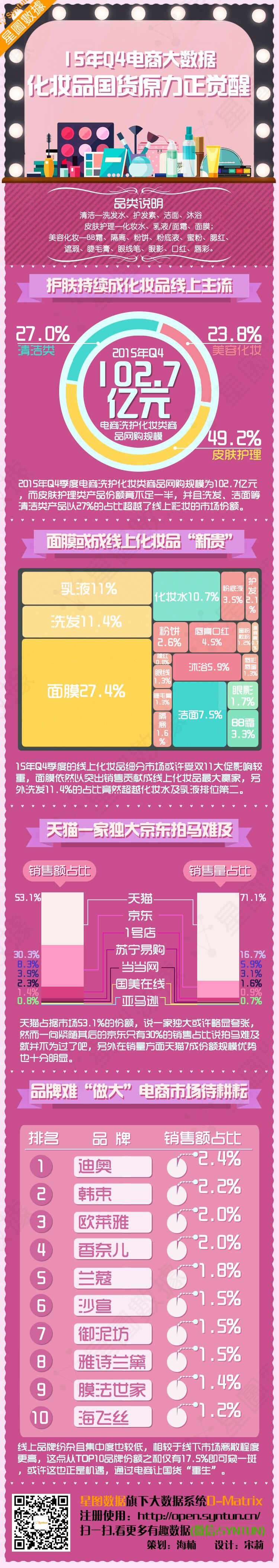 中國產業發展研究網訊:1月28日消息,星圖數據近日發布2015年Q4線上化妝品銷售數據。數據顯示,2015年第四季度,電商洗護化妝類商品網購規模達102.7億元。其中,皮膚護理類占比最高,達49.2%,清潔類占比27%,美容化妝類占比23.%。