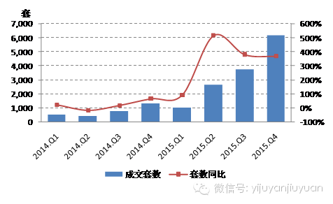 2015年四季度,一線城市豪宅公寓成交6159套,再創2014年以來的季度新高,環比增長65%,同比增長368%。2015年全年累計成交13770套,相比2014年增長350%,即增長了3.5倍,豪宅成交量的激增,堪稱2015年是豪宅元年也不為過。
