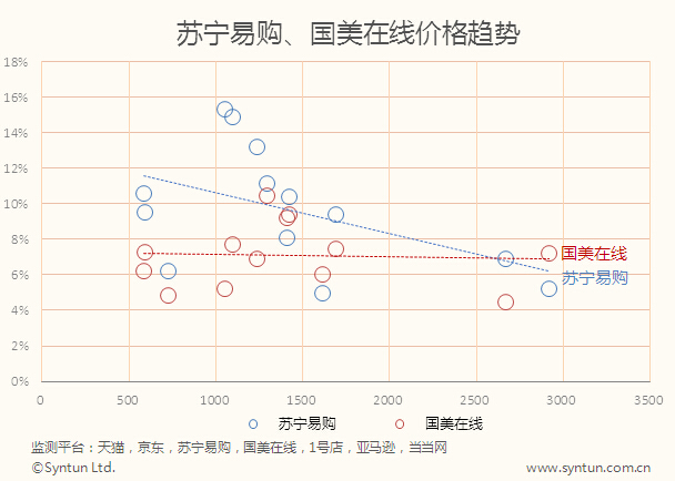 而對于同樣以3C家電為主的蘇寧易購和國美在線,在總價格段內份額走勢近似,品類均價超過500元后,卻呈現出了不同的趨勢。