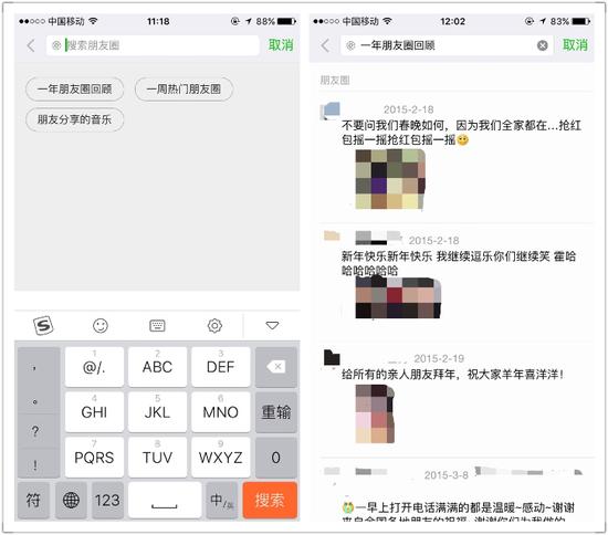 核心提示: 臨近農歷新年,當忙碌的的人們正在打包行李、奔波在春運路上時,也許早已忘了回顧這一年,但最新更新的一版微信巧妙地幫用戶解決了這個問題:在微信內點擊“搜索-朋友圈臨近農歷新年,當忙碌的的人們正在打包行李、奔波在春運路上時,也許早已忘了回顧這一年,但最新更新的一版微信巧妙地幫用戶解決了這個問題:在微信內點擊“搜索-朋友圈”時,微信自動列出了“一年朋友圈回顧”、“一周熱門朋友圈”和“朋友分享的音樂”這三個選項。