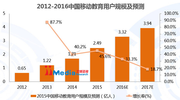 數(shù)據(jù)顯示,2015年中國移動教育用戶規(guī)模達到2.49億人,預計到2016年將達到3.32億人。
