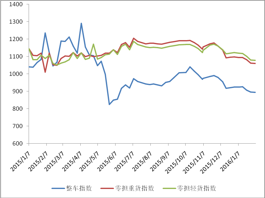 各車型指數環比均有所回落,其中整車指數回落幅度略高于零擔指數。本周,整車指數為894.9點,比上周回落0.22%,比年初回落3.3%,同比回落27.5%,降幅有所擴大;零擔輕貨指數為1077.7點,比上周回落0.21%,比年初回落4.0%;零擔重貨指數為1060.2點,比上周回落0.21%,比年初回落3.5%。