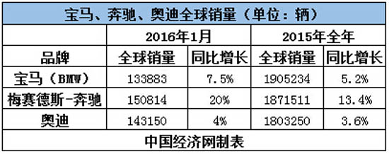 核心提示: 2016年1月銷量數據陸續出爐,奔馳增勢不減,以同比增長20%,相比上月提升10.9個百分點的超高增速,一舉拿下今年首個月度銷量冠軍。2015年度衛冕冠軍寶馬2016年1月銷量數據陸續出爐,奔馳增勢不減,以同比增長20%,相比上月提升10.9個百分點的超高增速,一舉拿下今年首個月度銷量冠軍。2015年度衛冕冠軍寶馬,增速雖由上月的負增長轉為正增長,但銷量上依然不敵奔馳、奧迪,落至第三。