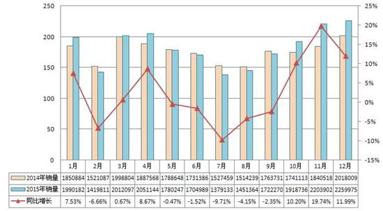 從發(fā)動機(jī)月度銷量走勢上看,月度銷量最高點(diǎn)為12月份,銷量達(dá)到226萬臺;最低點(diǎn)為7月,銷量僅為137.91萬臺。除2月、5月、6月、7月、8月和9月外,其余6個(gè)月銷量均高于2014年同期,其中,從5月開始,發(fā)動機(jī)月銷量連續(xù)下降,7月跌到最低點(diǎn),而后8月開始反彈,發(fā)動機(jī)銷量開始緩慢攀升,一直延續(xù)到年底,呈現(xiàn)“V”型走勢。值得注意的是9、10月份雖未現(xiàn)“金九銀十”態(tài)勢,但隨后幾月的銷量走勢也為年底各家企業(yè)的銷量沖關(guān)奠定了良好基礎(chǔ)。