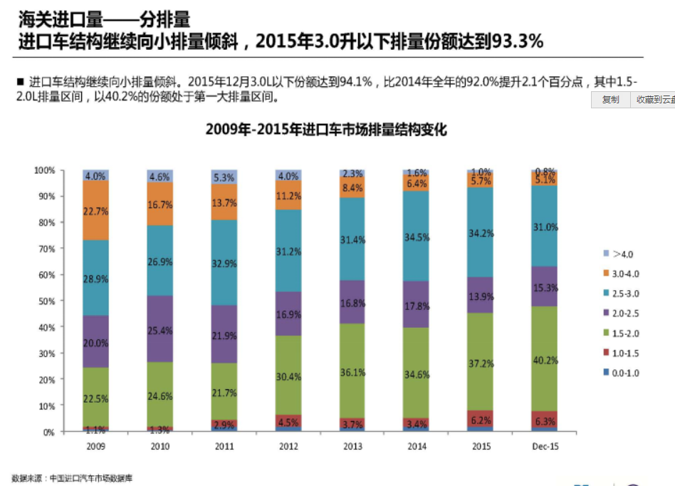 隨著節能減排法規的不斷加嚴,以及人們降耗、環保意識的日益增強,進口車發動機排量趨向中小型化。國機汽車的報告顯示,2015年,3.0升以下發動機排量進口汽車的市場份額高達93.3%,高于2014年的92%。其中1.5升-2.0升排量的車型占37.2%,為占比最大的排量區間,同樣高于上年度同為占比最大的這一排量區間的34.6%。