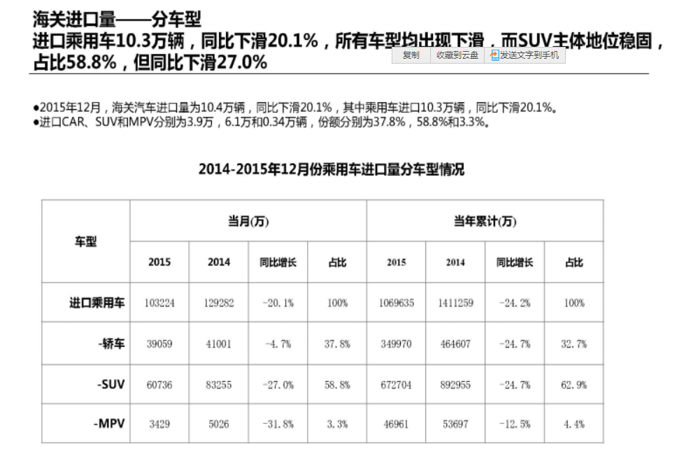 核心提示: 國機汽車股份有限公司近日發布的《中國進口汽車市場月度報告》(2015-12)顯示:2015年,進口汽車海關進口量為107.8萬輛,同比下降24.2%,調整態勢國機汽車股份有限公司近日發布的《中國進口汽車市場月度報告》(2015-12)顯示:2015年,進口汽車海關進口量為107.8萬輛,同比下降24.2%,調整態勢明顯。
