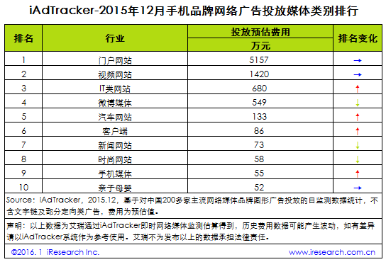 2015年12月手機品牌網絡廣告投放費用達8649萬元