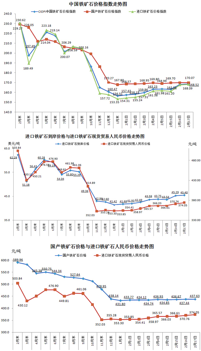 2月17日,中國鐵礦石價格指數(CIOPI)168.52點,環比上升0.33點,升幅為0.20%。其中:國產鐵礦石價格指數為170.07點,環比上升0.07點,升幅為0.04%;進口鐵礦石價格指數為168.09點,環比上升0.41點,升幅為0.24%。