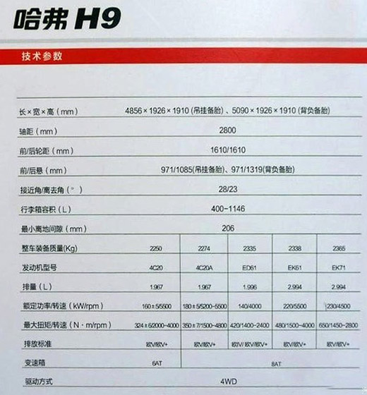 動力方面,新款哈弗H9將搭配上表提到的五款發動機。在傳動方面,2.0T汽油發動機低功率版匹配6速自動變速箱,其余發動機均匹配8速自動變速箱。但此前長城有關人員表示不會為H9配3.0T雙渦輪發動機,所以這次曝光的數據有待考證。
