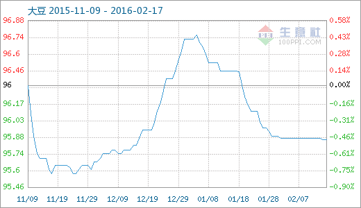 核心提示: 2月16日大豆商品指數為95.87,與昨日持平,較周期內最高點117.47點(2013-03-29)下降了18.39%,較2015年11月25日最低點95.52月16日大豆商品指數為95.87,與昨日持平,較周期內最高點117.47點(2013-03-29)下降了18.39%,較2015年11月25日最低點95.58點上漲了0.30%。(注:周期指2011-09-01至今)