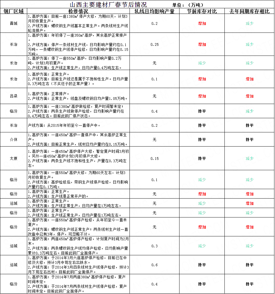 核心提示: 檢修方面:據(jù)對(duì)山西區(qū)域調(diào)研的19家鋼廠統(tǒng)計(jì),春節(jié)期間山西地區(qū)鋼廠前期檢修的依舊在進(jìn)行跨年檢修,節(jié)后檢修基本接近尾聲,鋼廠紛紛表示最快2月底復(fù)產(chǎn),最慢也在3月初