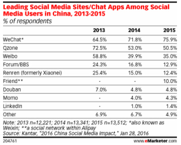 2015年,微信仍然是中國社交媒體領域的霸主,使用率連續增長,2015年的使用率達到了75.9%,自2014年打敗了QQ空間后一直處于第一位置。QQ空間的份額從2013年開始大幅下滑,但仍然占據二位,微博獲季軍。