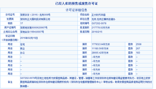 2月15日,深圳樓市春節后首張預售證出爐,為正大時代華庭,預售證號:深房許字(2016)龍崗009號,預售總套數2958套,其中住宅2508套,辦公183套,商業267套,住宅備案均價最低7983元/平方米,最高9667元/平方米。