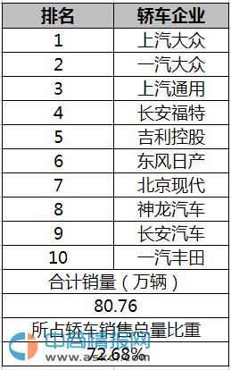 2016年1月前十家轎車生產企業銷量排名:上汽大眾第一
