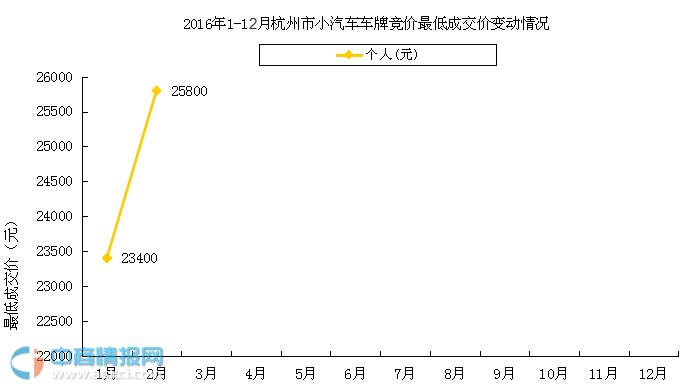 2016年2月杭州車牌競價的個人最低成交價為25800元,較上個月上漲了2400元。杭州車牌競拍價自去年11月開始上漲后,這股上漲趨勢一直延續到2016年2月,已經連續四個月上漲。