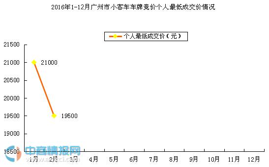 2016年2月廣州車牌競價個人最低成交價為19500元,最終跌破2萬元。廣州的車牌競價個人最低成交價在去年8月出現過一次“斷崖式暴跌”一直上漲,直到1月的車牌競拍個人最低成交價才回落下跌,下跌趨勢延續到本月。