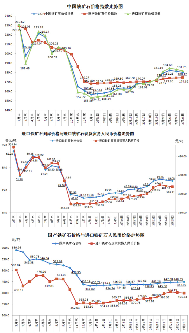 2月25日,中國鐵礦石價格指數(CIOPI)180.12點,環比下降1.11點,降幅為0.61%。其中:國產鐵礦石價格指數為174.32點,環比上升0.23點,升幅為0.13%;進口鐵礦石價格指數為181.75點,環比下降1.48點,降幅為0.81%。