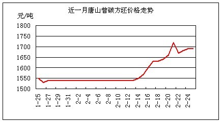 核心提示: 春節過后,唐山鋼坯持續上漲,短短九天時間大漲180元/噸至1720元/噸,令市場人士大跌眼鏡。本輪大漲一方面是因為節后“開門紅”的氛圍,輔以對之前持久低迷的報春節過后,唐山鋼坯持續上漲,短短九天時間大漲180元/噸至1720元/噸,令市場人士大跌眼鏡。本輪大漲一方面是因為節后“開門紅”的氛圍,輔以對之前持久低迷的報復性反彈;另一方,也是主要原因,那就是節前節后大多數鋼坯廠家接有不少出口訂單,導致年后國內市場投放量不足,現貨資源偏緊。