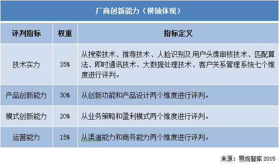 Analysys易觀智庫分析認為,婚戀交友作為階段性需求,本身存在一定人群和服務時間限制。在婚戀用戶數與用戶生命周期有限的條件下,優秀的產品與服務創新就成為廠商爭奪用戶的關鍵。技術實力、產品創新能力、模式創新能力和運營能力是評價廠商現有創新能力的重要指標。