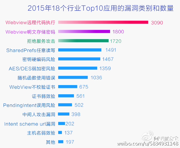 除了病毒,漏洞也是危害移動端的主因,而APP無疑是重災區。年報顯示,97%的熱門APP存在漏洞風險。