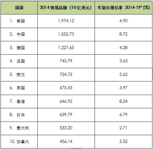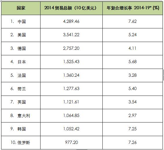 報(bào)告指出,中國已成為全球最大貿(mào)易國(表一)和最大出口國(表二),同時(shí)也是全球第二大進(jìn)口國(表三)。雖然中國經(jīng)貿(mào)持續(xù)增長(zhǎng)引發(fā)了國際社會(huì)的擔(dān)憂,但《晴雨表》顯示,未來五年中國的年增長(zhǎng)率預(yù)計(jì)為6.98%——而在上次報(bào)告中同期數(shù)字為5.60%,中國的主導(dǎo)地位將依舊堅(jiān)挺。MandhirSingh對(duì)此發(fā)表了中肯的看法:“中國在世界貿(mào)易當(dāng)中的領(lǐng)先地位在未來幾年都不會(huì)動(dòng)搖。但是市場(chǎng)對(duì)中國能否保持現(xiàn)在的增長(zhǎng)速度存有擔(dān)憂。而且中國的現(xiàn)有政策是從出口為導(dǎo)向的經(jīng)濟(jì)轉(zhuǎn)為擴(kuò)大內(nèi)需,不斷提升民眾的生活質(zhì)量,因此其影響力還有待觀察。”
