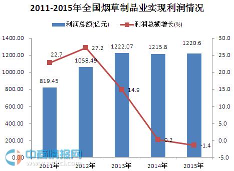 2015年全國煙草制品業實現年利潤總額為1220.6億元,同比下滑1.4%。由上圖可知,2011-2014年中國煙草制品業利潤總額每年都呈上漲的態勢,除了2015年煙草制品業利潤總額是負增長。2012-2015年,中國煙草制品業利潤總額增長率都延續著下滑的趨勢,從2012年的27.2下滑至2015年的-1.4%。
