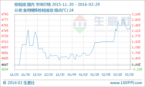 核心提示: 據監測數據顯示,本月國內棕櫚油價格震蕩上漲,月初國內24度棕櫚油現貨價格4712.00元/噸,月末4758.00元/噸,上漲0.98%。二、市場分析市場:2月一、國內棕櫚油價格走勢圖