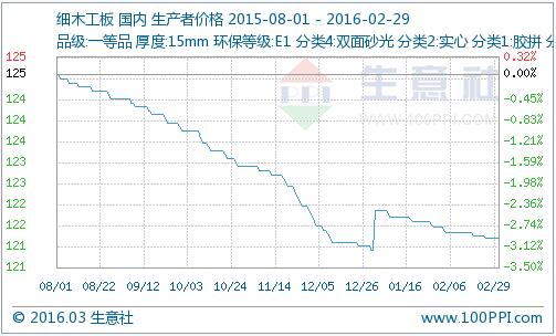 核心提示: 據生意社監測,本月板材價格持續下行趨勢,月初細木工板價格為122.06元/張,中密度纖維板價格為73.00元/張;月末細木工板價格為121.81元/張,跌幅為一.價格走勢圖