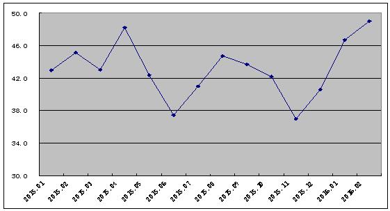 2月份,鋼鐵行業生產指數三連升至49.5%,較上月回升3.9個百分點。與此同時,和生產相關的采購活動呈現明顯的擴張趨勢。當月采購量指數回升5.5個百分點至50.4%,時隔15個月以后重回50%以上的擴張區間,為2014年11月份以來的最高;2月份原材料進口指數為52.6%,較上月上升0.9個百分點;當月原材料庫存指數三連升至51.1%,時隔11個月重回50%的榮枯線以上,為2015年2月份以來的最高。從這幾個指數的走勢變化情況來看,近期鋼價反彈使鋼廠利潤進一步改善,鋼廠復產意愿增加,產量開始增長,且對后市預期樂觀,鋼廠原料采購的積極性明顯提高。
