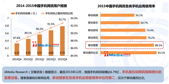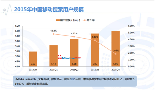 截止2015年12月,中國移動搜索用戶已經達到6.01億,增長相比以往有所放緩。而移動搜索在各類手機應用使用率中位居第二,僅次于移動通訊社交。