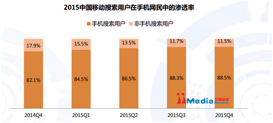 截至2015年底,中國移動搜索用戶在手機網民中的滲透率達到88.5%。艾媒分析師認為當前移動搜素用戶滲透率已達較高水平,新增用戶規模有限,未來各大移動搜索應用用戶規模的競爭將集中于用戶搜索體驗優化、產品功能創新等方面。