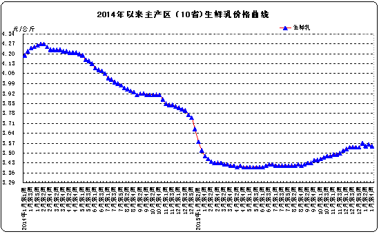 據農業部對全國500個集貿市場畜禽產品和飼料價格定點監測,1月份第4周(采集日為1月27日)我國生鮮乳價格環比下跌0.3%。內蒙古、河北等10個奶牛主產省(區)生鮮乳平均價格3.55元/公斤,比前一周下降0.3%,同比上漲2.0%。