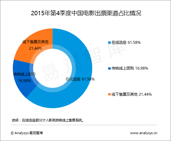 根據《2015年第4季度中國電影出票渠道競爭格局》可知,本季度中國電影在線票務(包括傳統線上團購和在線選座)市場份額已經達到78.56%,較上季度增長4.22%,線上化率的增長率進一步走低。對于目前的影市來說,接近8成的線上化率意味著線上購票的直接增長幅度趨頂,不過寄望于廣闊的三五線城市逐漸崛起,線上購票的整體規模仍擁有巨大增長空間,三五線城市的觀眾觀影習慣前期仍需要一定的“票補”去拉動,再加上上學和外出務工也導致其青少年這一主力觀影人群的缺失,對三五線城市觀影爆發性成長構成一定影響,所以未來中國電影購票的線上化率將保持水平增長,難再有大的增長波動。