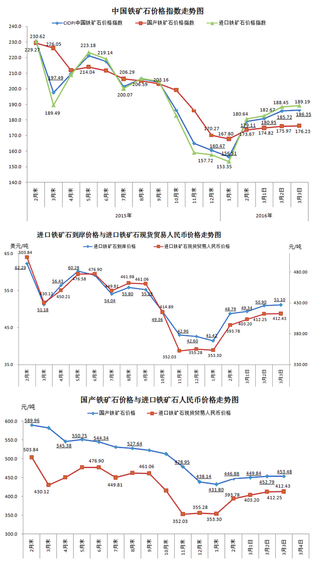 3月3日,中國鐵礦石價格指數(CIOPI)186.35點,環比上升0.64點,升幅為0.34%。其中:國產鐵礦石價格指數為176.23點,環比上升0.26點,升幅為0.15%;進口鐵礦石價格指數為189.19點,環比上升0.74點,升幅為0.39%。