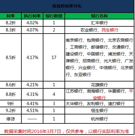 目前,北京本地30家銀行中,除杭州銀行停貸,首套房首付均為三成,其中匯豐銀行利率最低8.2折,為4.02%;民生銀行為8.3折,恒生銀行利率為9.2折,大華銀行、渣打銀行、友利銀行利率為9折,渤海銀行、華夏銀行、江蘇銀行、渤海銀行、華夏銀行、平安銀行利率為8.8折,花旗銀行為8.6折,南京銀行、包商銀行、北京農商銀行、工商銀行、郵儲銀行、交通銀行、建設銀行、中國銀行、浦發銀行、天津銀行、招商銀行、光大銀行、廣發銀行、興業銀行、中信銀行、北京銀行、東亞銀行利率為8.5折。