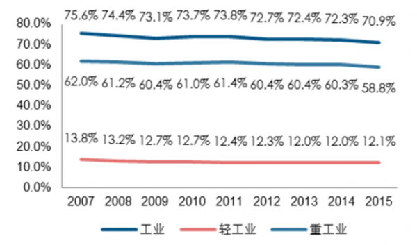 2015年,工業用電量 39348億千瓦時,同比下降 1.4%,增速比上年降低 5個百分點,為近些年來首次出現負增長。具體來看:2015 年,輕工業用電量 6729億千瓦時,同比增長 1.3%,增速比上年降低 2.6 個百分點。由于出口下滑、國內經濟下行,輕工業用電量增速繼續放緩。2015 年,重工業用電量32620 億千瓦時,同比下降 1.95%,增速比上年降低 5.5個百分點。受房地產市場低迷影響,黑色金屬冶煉和建材行業用電量同比大幅下滑,帶動重工業用電量負增長。2015 年,我國工業及其重工業用電占全社會用電量比重均回落,但仍保持高位,分別占比 70.9%、58.8%,比上年分別下降 1.38和 1.48 個百分點。工業中的輕工業用電占全社會用電比重連續 10 年持續下降后有所回升,2015 年輕工業占全社會用電量比重 12.12%,同比增加 0.1 個百分點。